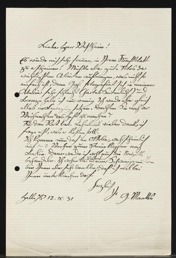 Handwriting of the artist to the art critic Paul Westheim (1886 - 1963): "Dear Mr. Westheim! It would give me great pleasure to appear in your art journal. Would have to bring up good photos of the most important works, however, which is not so easy [...] Cordially yours G. Marcks". Folded several times, left margin punched.