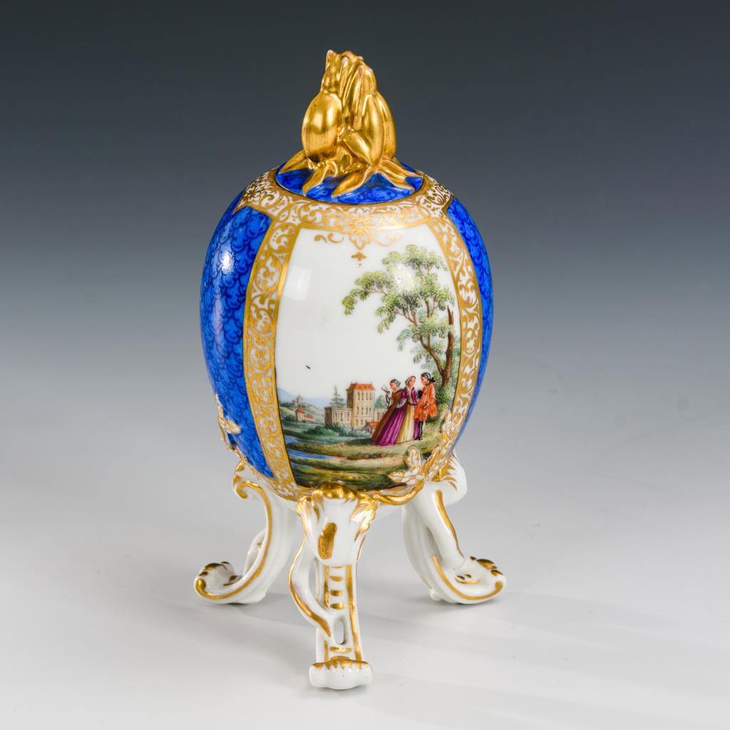 Ovoide Dose mit Flammenknaufdeckel, auf drei Rocaillefüßen. Auf der Wandung alternierend angeordnete Felder mit blauem Schuppenmuster sowie Felder mit Watteaumalerei. Minimaler Goldabrieb, 1x Schuppenfond mit minimalen Farbfehlstellen.