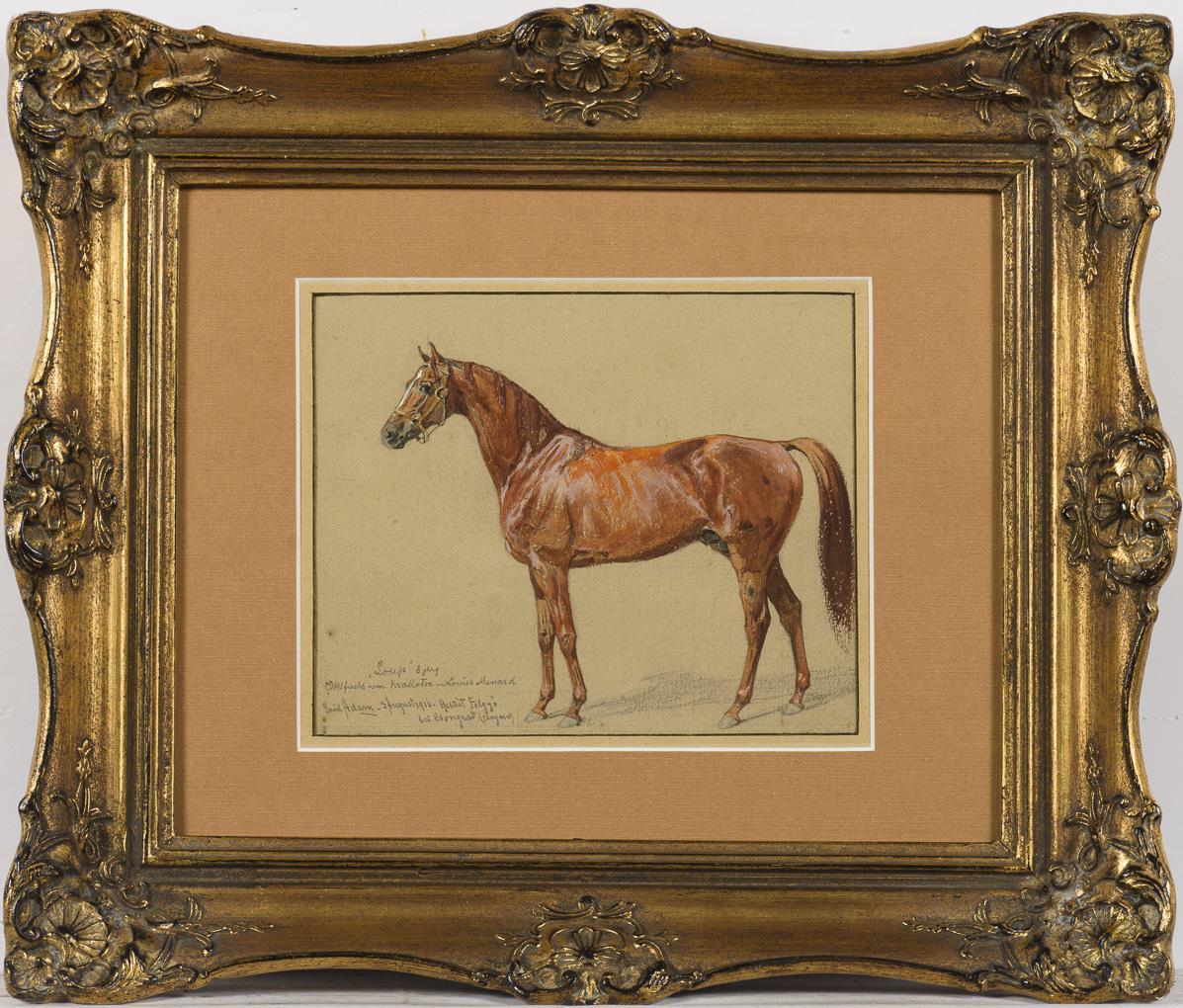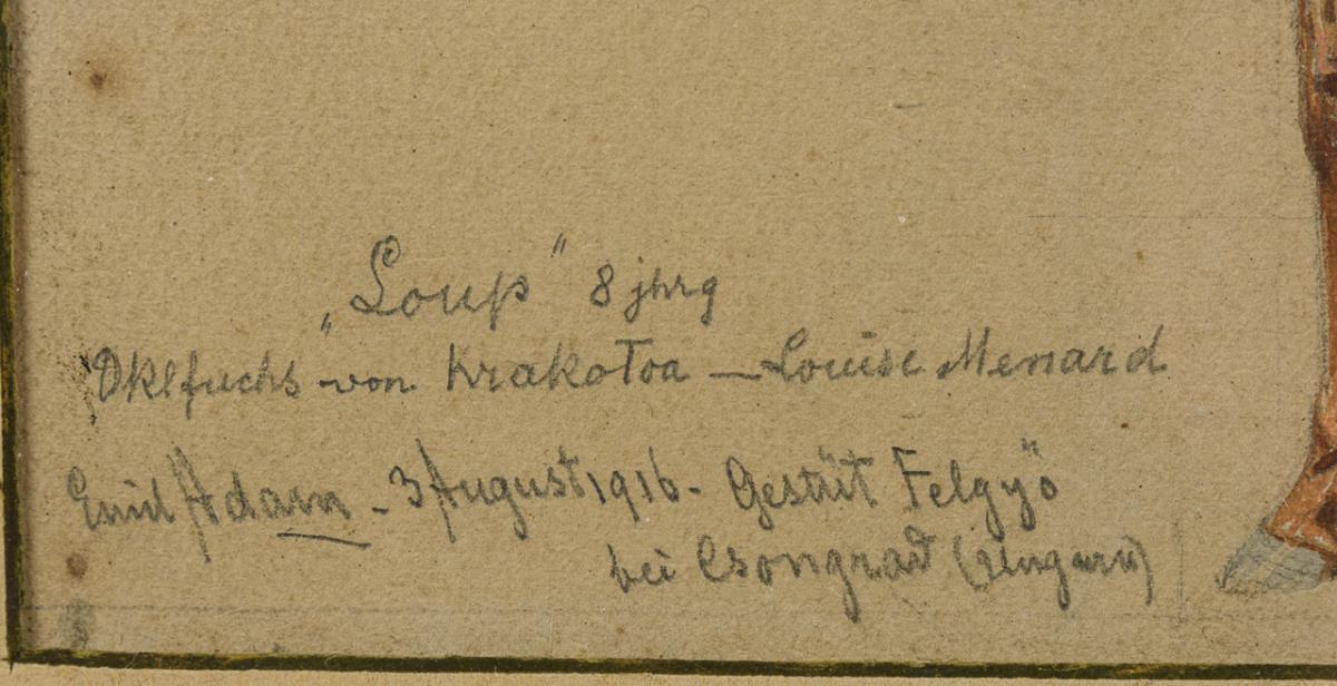 Watercolor/Gouache. Signed lower left with partly indistinct addition "...Felgyö Stud Farm...". Dated: 3 August 1916.