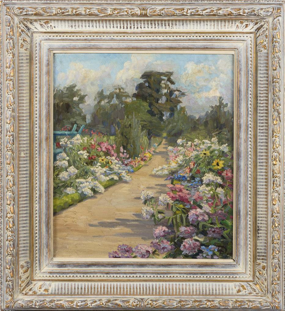 Bright sunlight over the numerous flowering plants along the rectilinear path.