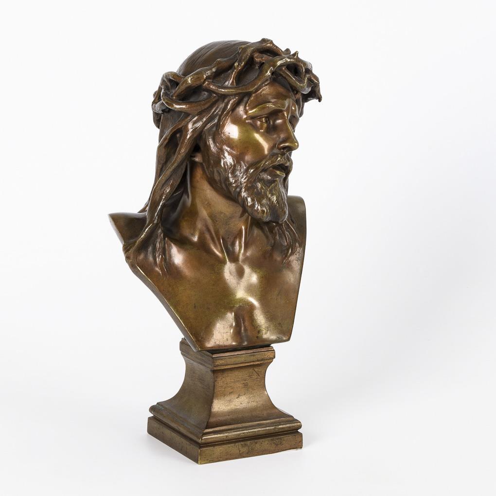 Suffering Savior looking sideways with crown of thorns. Patina rubbed.