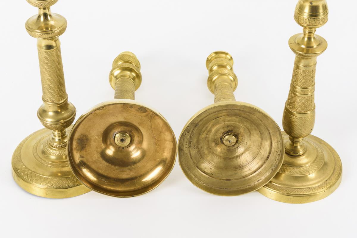 Each decorated with fine relief fornament bronze candelabra; each without insertion sleeves. 1x slight misalignment and warped stand ring, 2x minimal open solder seams.