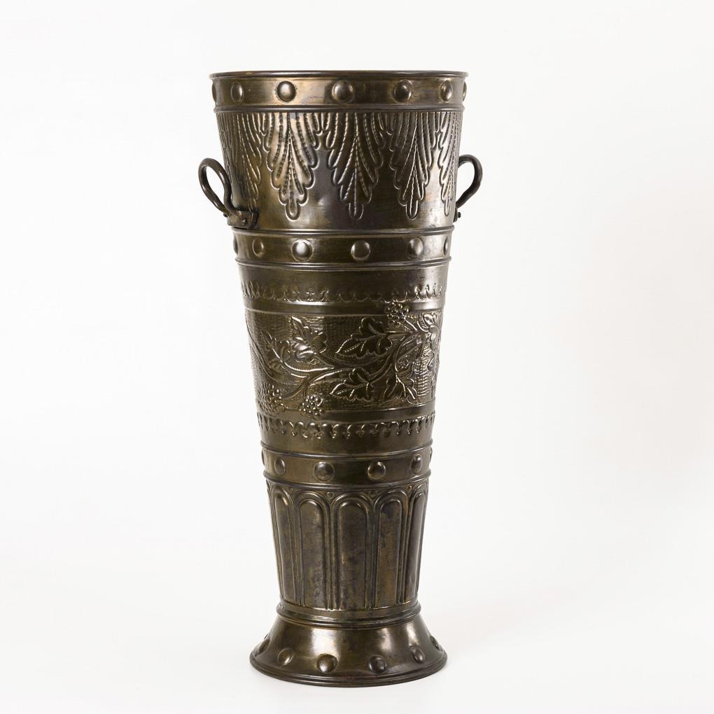 Tapered stand with surrounding vines, leaves and ornament in relief and riveted handles. Scarcely any signs of age/use.