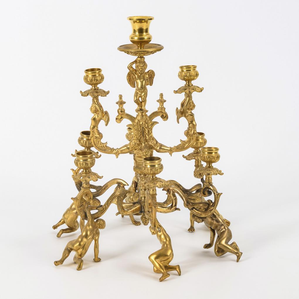 Unusual 9-flame candlestick with support figures.