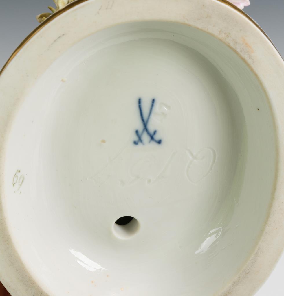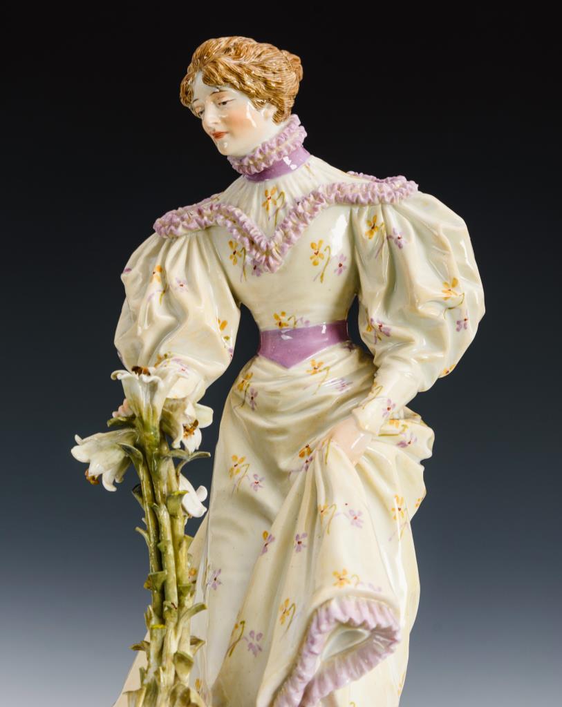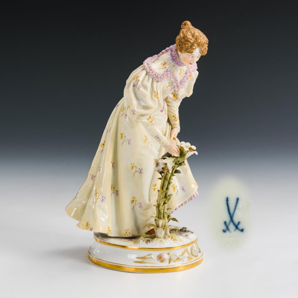 Elegante, Lilien pflückende Dame im rüschenbesetzten Kleid. 3 Lilienblüten restauriert, Bestoßungen an einigen Lilienblättern.