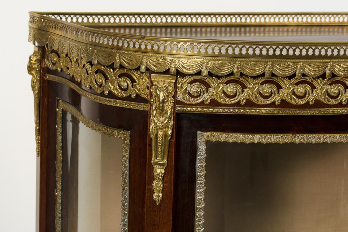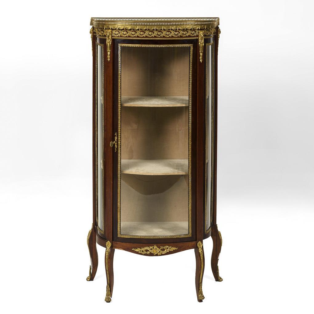 Small 3-sided glazed salon display case on slightly flared legs; 1-door, slightly drum-shaped body with brass applications in classical style and brass balustrade; inside lined with champagne-colored velvet and 2 shelves. Signs of age/use, lock defective.