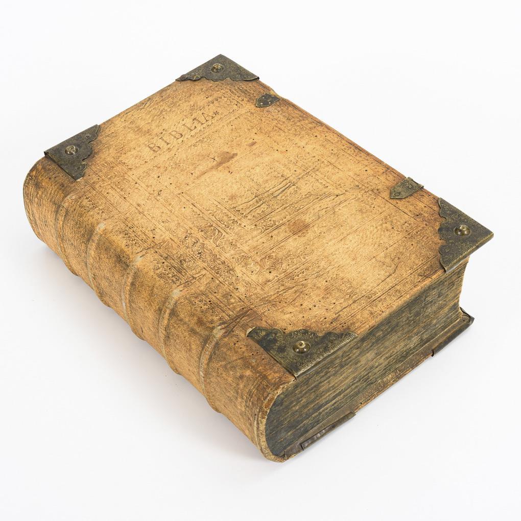 Title copperplate, title page, (57), 10 copperplate engravings of members of the Saxon noble house together with description, (14 pages and portrait of Luther), 1181, (23) pages. Embossed vellum binding with metal corners. Closures missing, cut out of endpapers corner, signs of wear due to age.