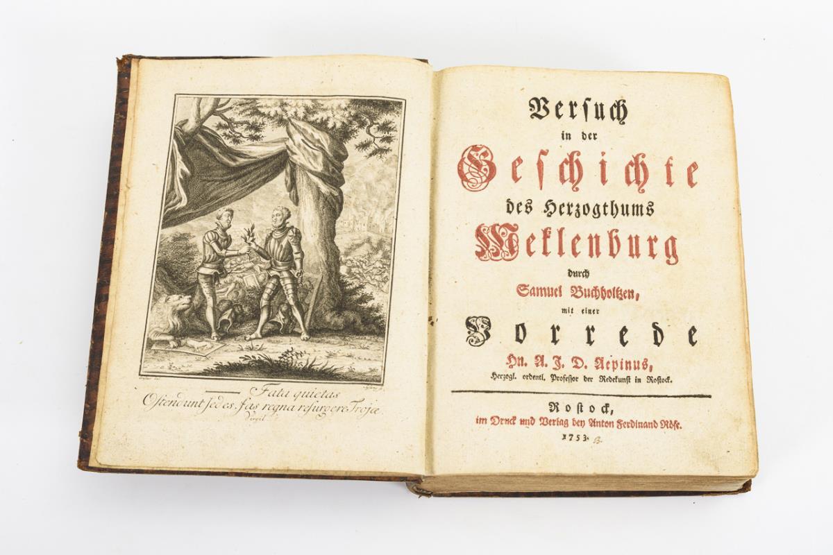 Title copy, title, (8), 18, 776 pages, 8 plates, (24) pages of index. With a preface by A.J.D. Aepinus. History of Mecklenburg from the Wandals to 1753, and in the appendix of the Counts and Bishops of Schwerin. Leather binding. Occasional handwritten entries. Due to age signs of use.
