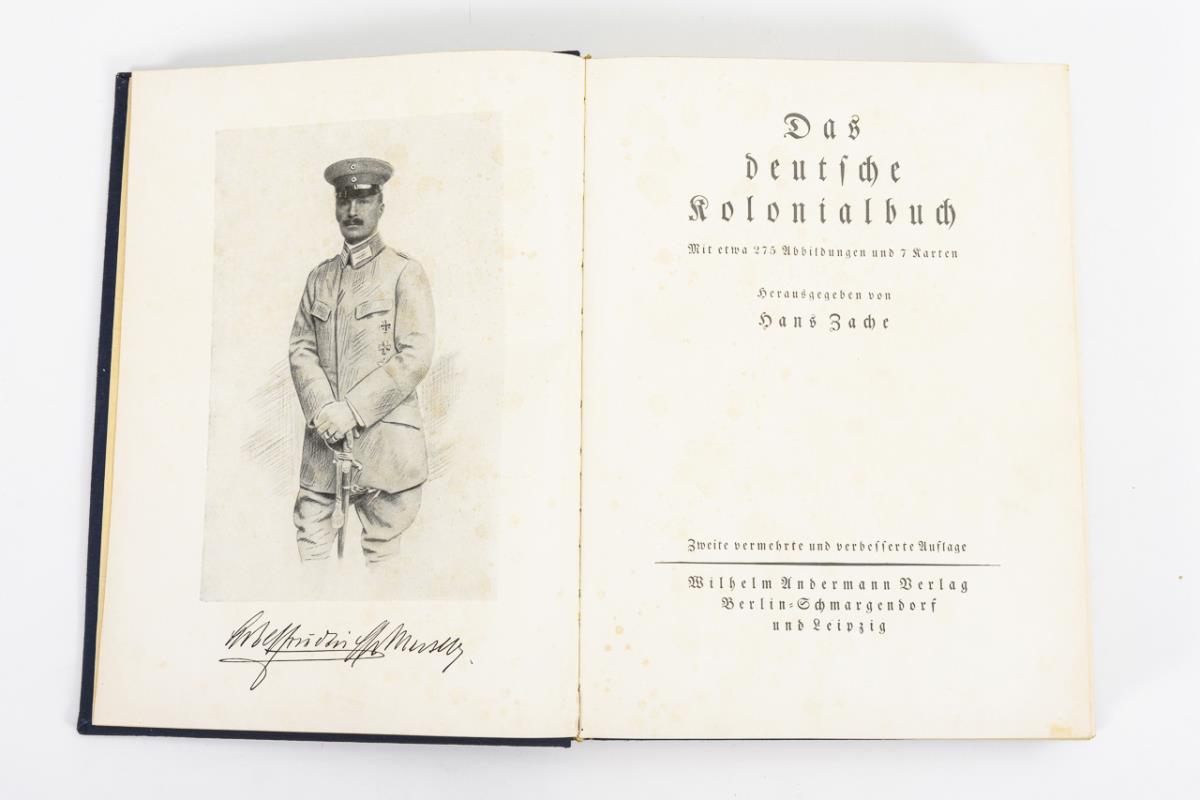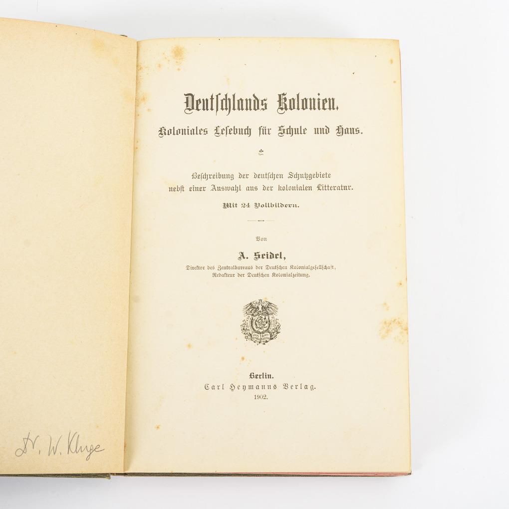 Hans Zach: "Das deutsche Kolonialbuch", Berlin-Schmagendorf u. Leipzig 1926, 2nd increased and improved edition, 512 pages with illustrations and seven maps. Blue cloth binding / Walther Beckmann: "Unsere Kolonien und Schutztruppen - Das Ehrenbuch der Überseekämpfer", Berlin 1934, 156, 168, 170, (6) pages. Light cloth binding. / A. Seidel. "Deutschlands Kolonien - Koloniales Lesebuch für Schule und Haus," Berlin 1902, 284 pages. Gold-stamped cloth binding. All with signs of age and wear, some foxing.