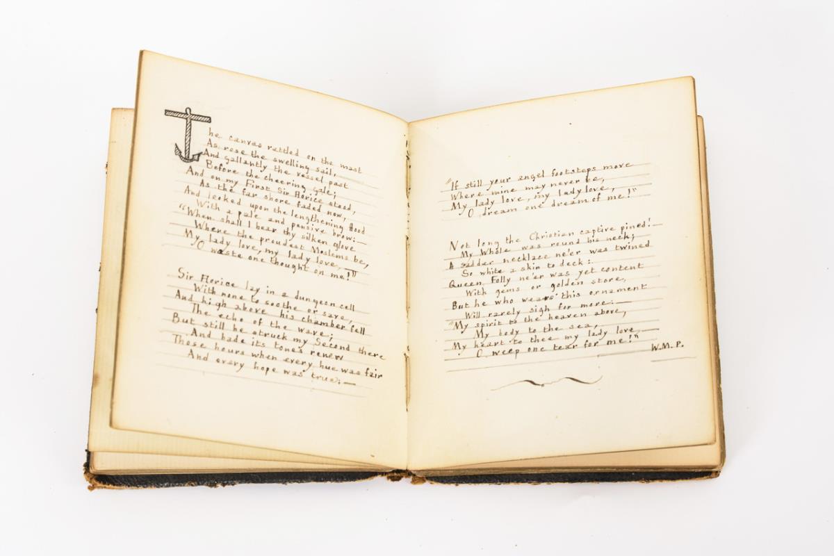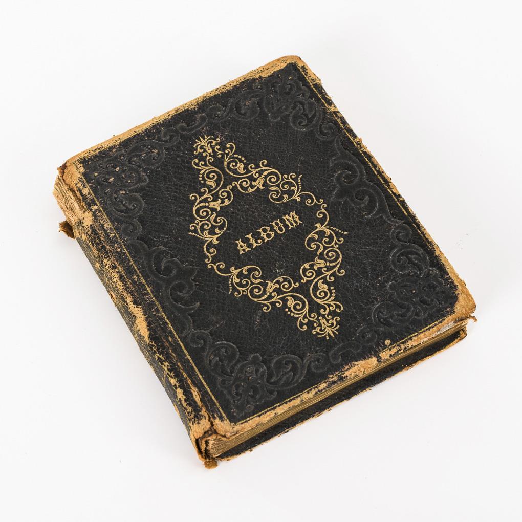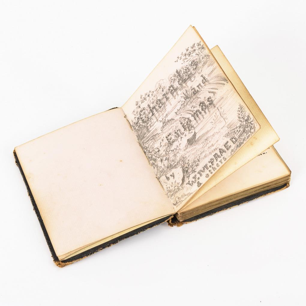 Book almost entirely written with riddles in verse. Mostly romantic drawings and 1 portrait of the poet Alfred Jennyson and watercolors with flowers and portrait of women. Binding with strong signs of age / wear.