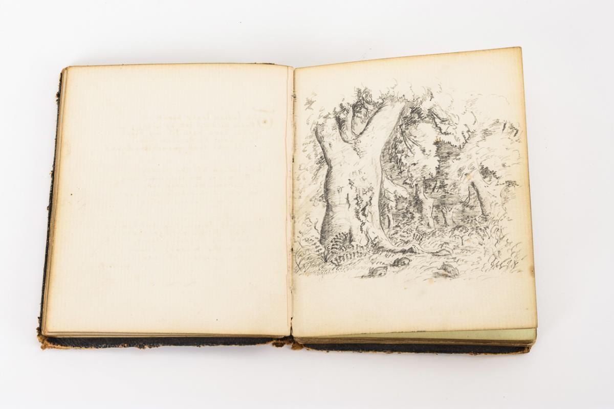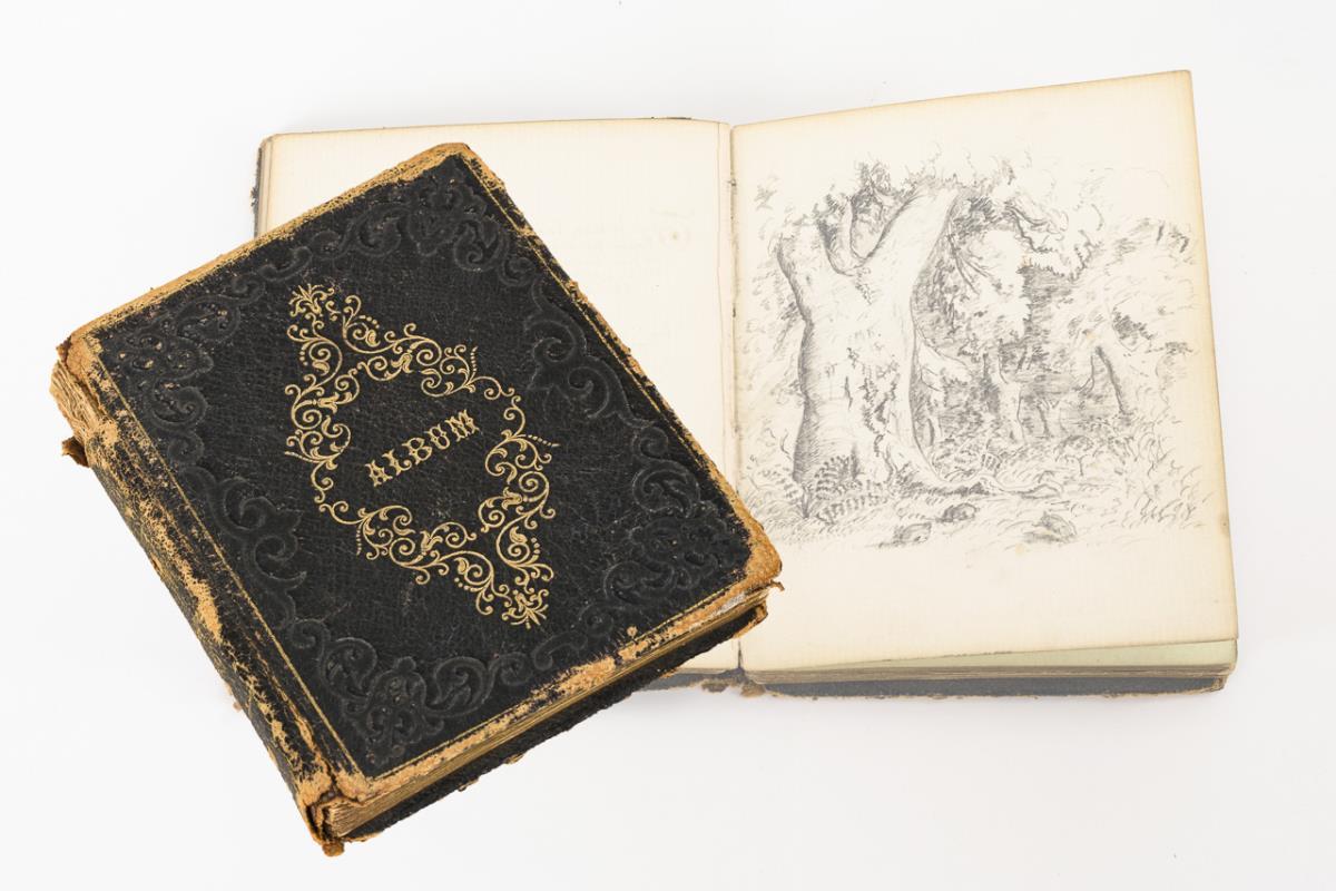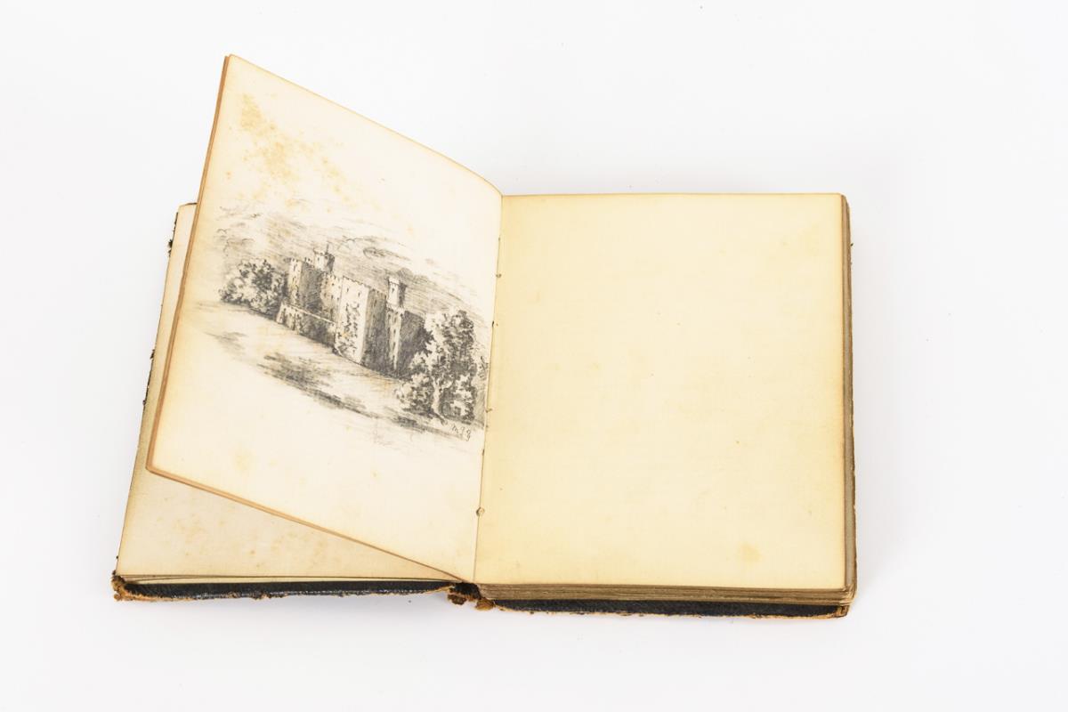 Leather binding with blind and gold embossing, gilt edges, about 25 pencil drawings, 3 watercolors and 1 ink drawing.