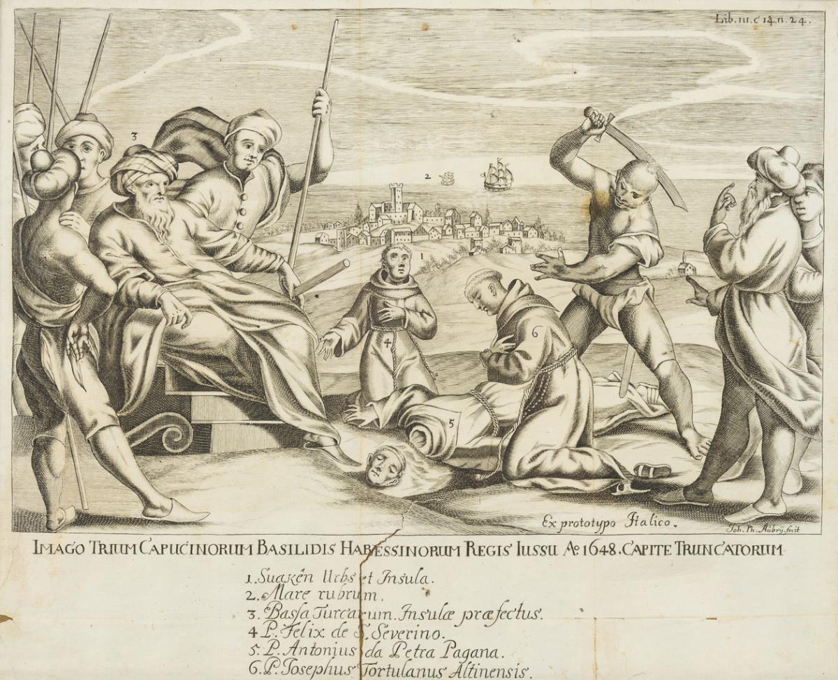 Picture of the execution of three Capuchin brothers under Basilides, king of the Habessines in 1648, inscribed "Imago Trium Capucinorm Basilidis Habessinorum Regis Iussu Ao 1648. Capite Trun Catorum", with legend; from Job Ludolf's "Historica Aethiopica", 1681. Sheet with creases and tears.