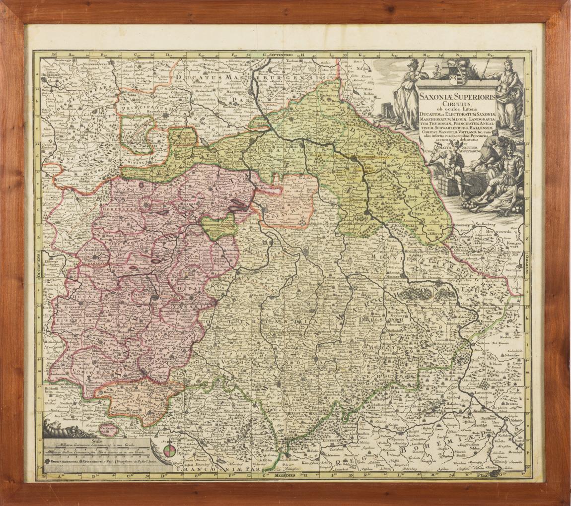 Historical map of the Upper Saxon Empire, with detailed title cartouche "Saxoniae Superioris Circulus, ob oculos fistens [...]". Buckling, traces of handling and creasing, stained, tears taped behind.