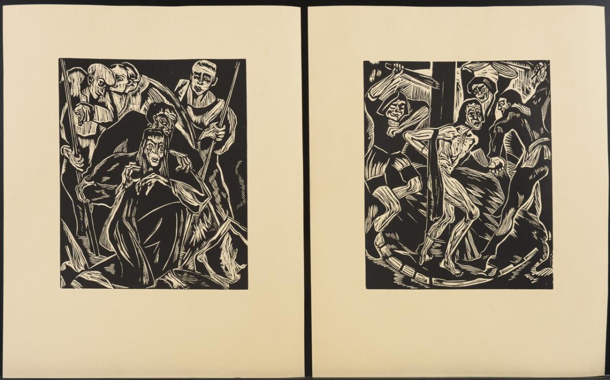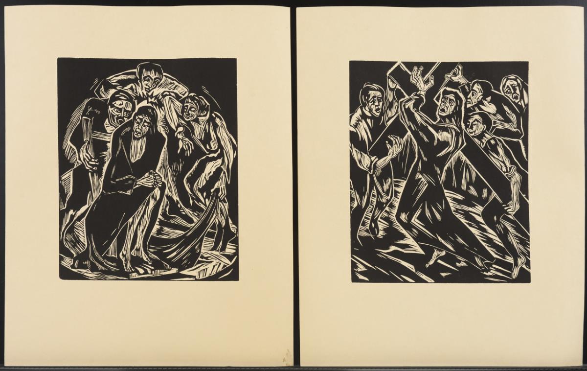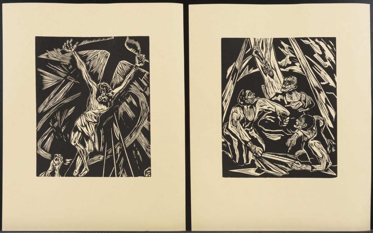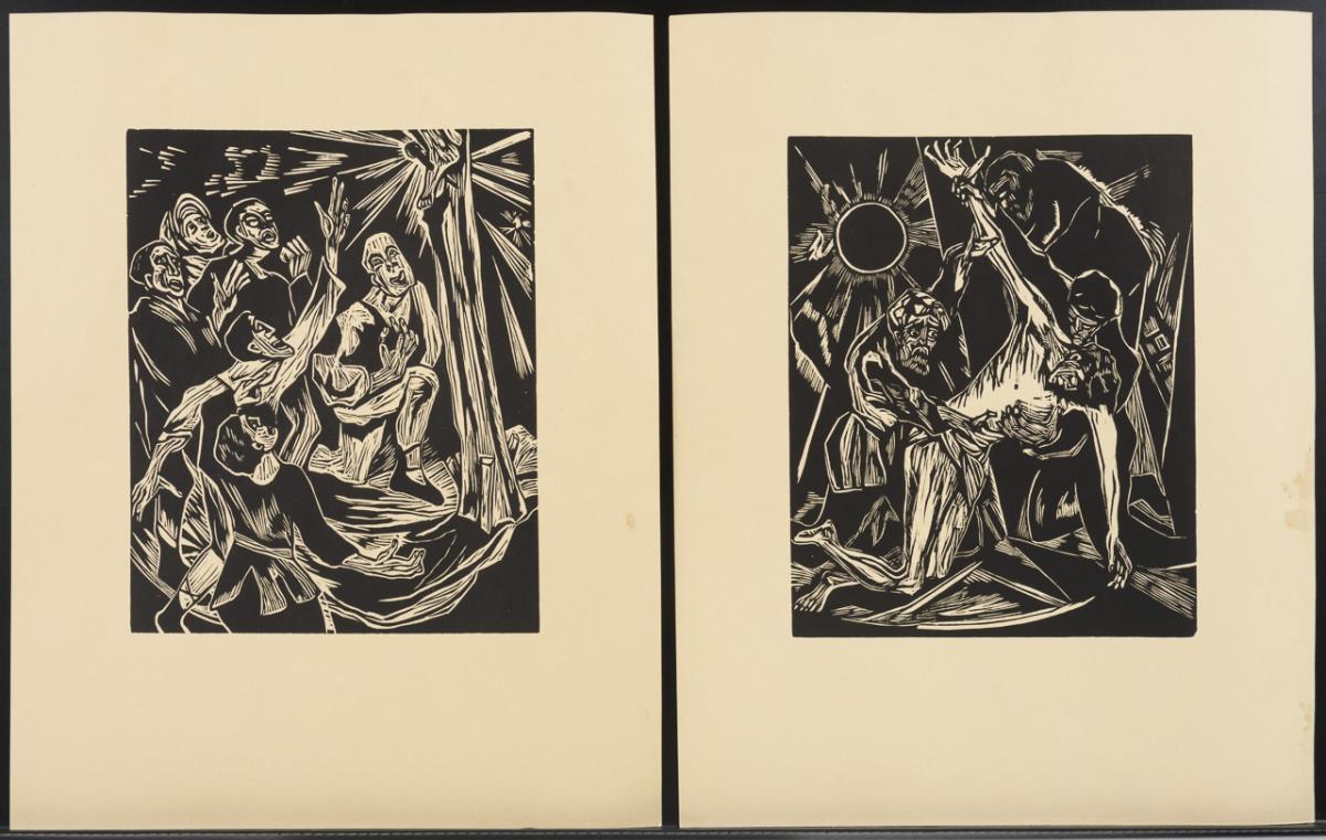"Farbige Erlebnisse" - complete portfolio with 6 color linocuts by Aemilian Baudnik, each with pencil signature, plus title fold-out with preface by Friedrich Düsel, Berlin 1924, original fold-out folder 38 x 29 cm, leaves with traces of handling and light water stains, Folder with traces of use | "The Passion" - complete portfolio with 10 woodcuts by Hermann Dienz, plus hand-signed title folder with foreword by Wilhelm Michel, Berlin 1924, original folding folder 43 x 34.5 cm, leaves partly somewhat stained, folder with slight damage.