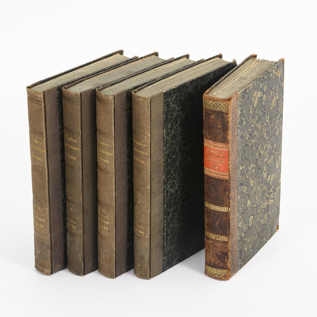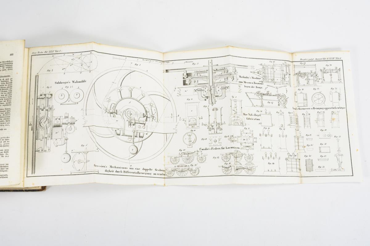 Descriptions of all possible technical innovations and findings of the time, with some plates. Half cloth or once in half leather binding.