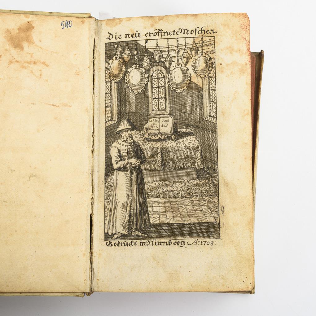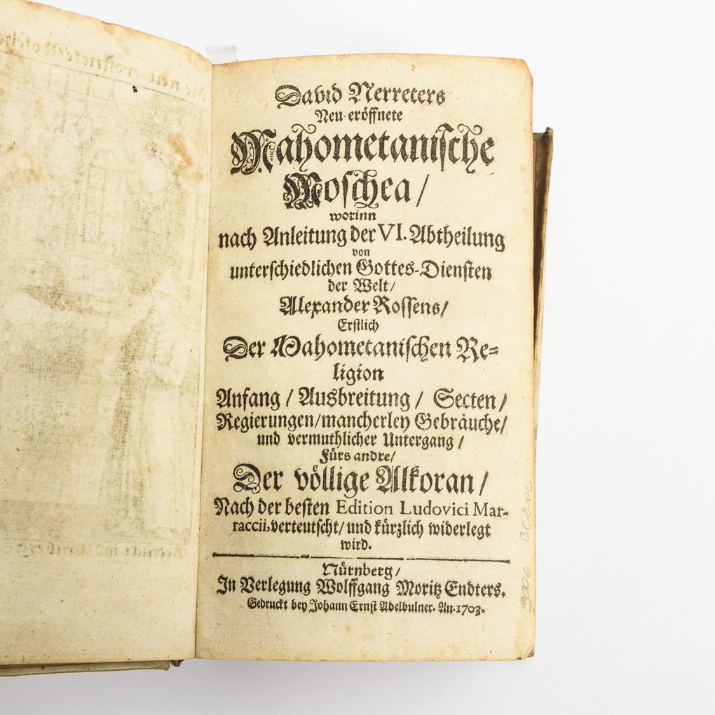 "... wherein after instruction of the VI. Abtheilung von unterschiedlichen Gottes-Diensten der Welt, Alexander Rossens, erstlich Der Mahometanische Religion Anfang, Ausbreitung, Secten, Regierungen, mancherley Gebräuche, und vermuthlicher Untergang, Fürs andere der Alkoran, nach der besten Edition Ludovici Maraccii, verteutscht und kürzlich widerlegt wird".