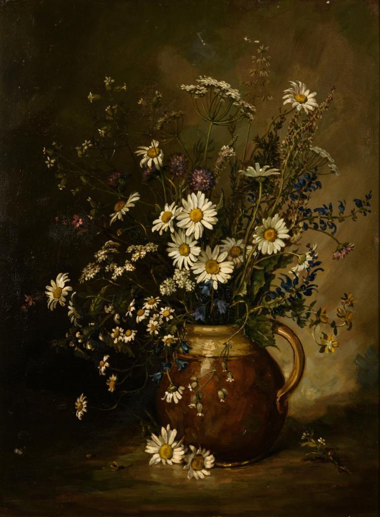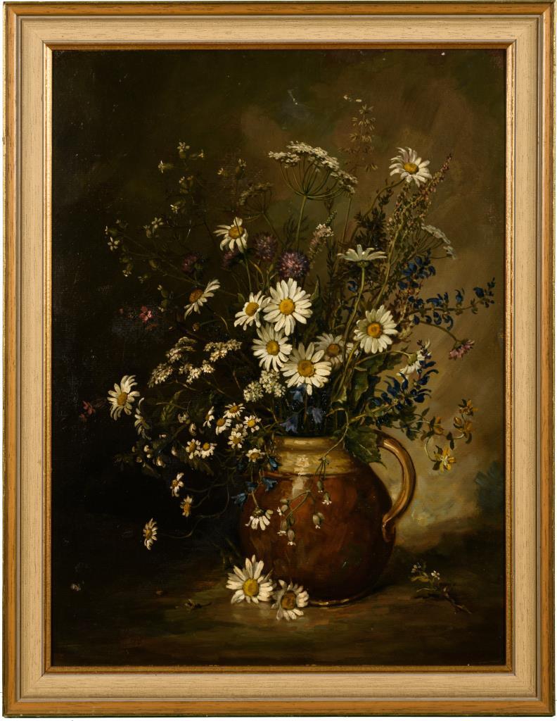 Margeriten und andere Blumen in einer Kanne. Leichte Altersspuren.