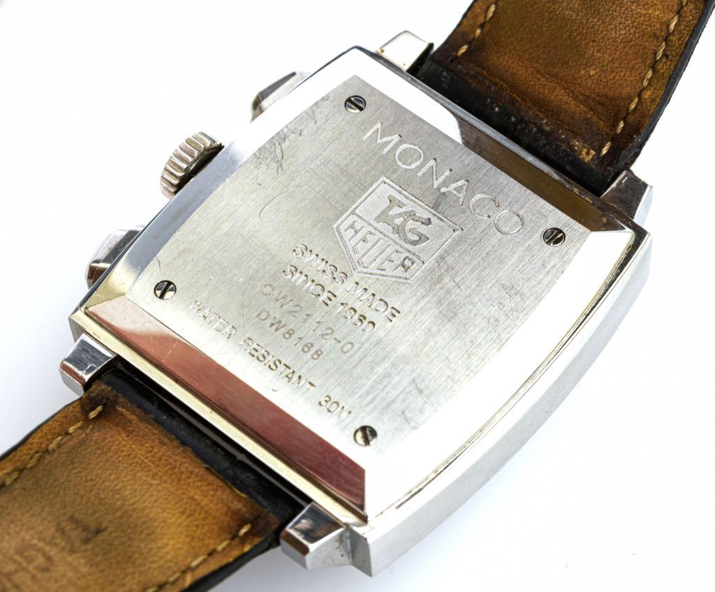 Gehäusenummer: DW8168.Referenznr.: CW2112-0.Automatikwerk mit Federkrone.Silberfarbenes Zifferblatt mit fluoreszierenden Stundenindizes und Stabzeigern, Minuterie, Hilfszifferblätter Sekunde, 30-Minuten und 12-Stunden, Zentralsekunde für Stoppuhrfunktion.Herstellerprägung Anzeige: "Tag Heuer, Monaco".