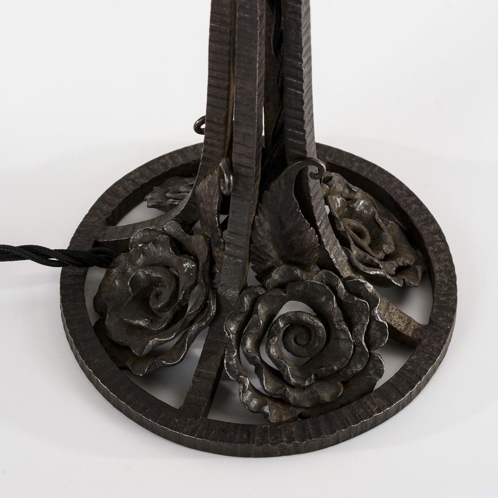 Bell shade on a wrought iron base worked in the manner of Brandt with four-strut shaft and round base with four plastic flowers. Electrified (function not tested)