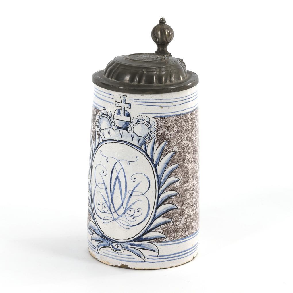 Cylindrical jug with manganese-glazed wall and line-decorated ribbon handle. On the front a crowned oval reserve with mirror monogram, below initials "FR". Profiled pewter lid with relief plaque and ball pusher, engraved "WS". Glaze rubbing and slight rim bumps, pewter lid partially holey.