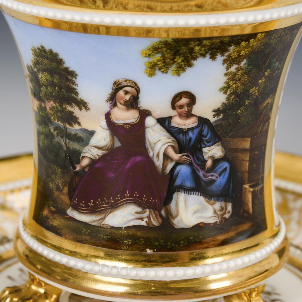 Crater cup with pearl bands, swan head handle and three paw feet. On the front a rectangular cartouche depicting two young Biedermeier ladies in a landscape, on the verso vegetal gold painting, in the mirror of the saucer the dedication "Dem golden Jubelpaar den 28ten Juny 1843.". Handle glued, partial minimal gold abrasion.
