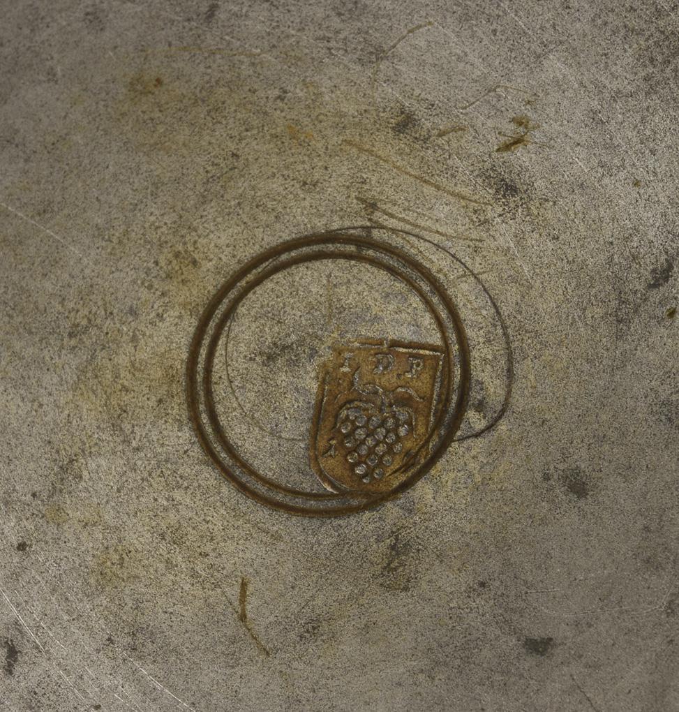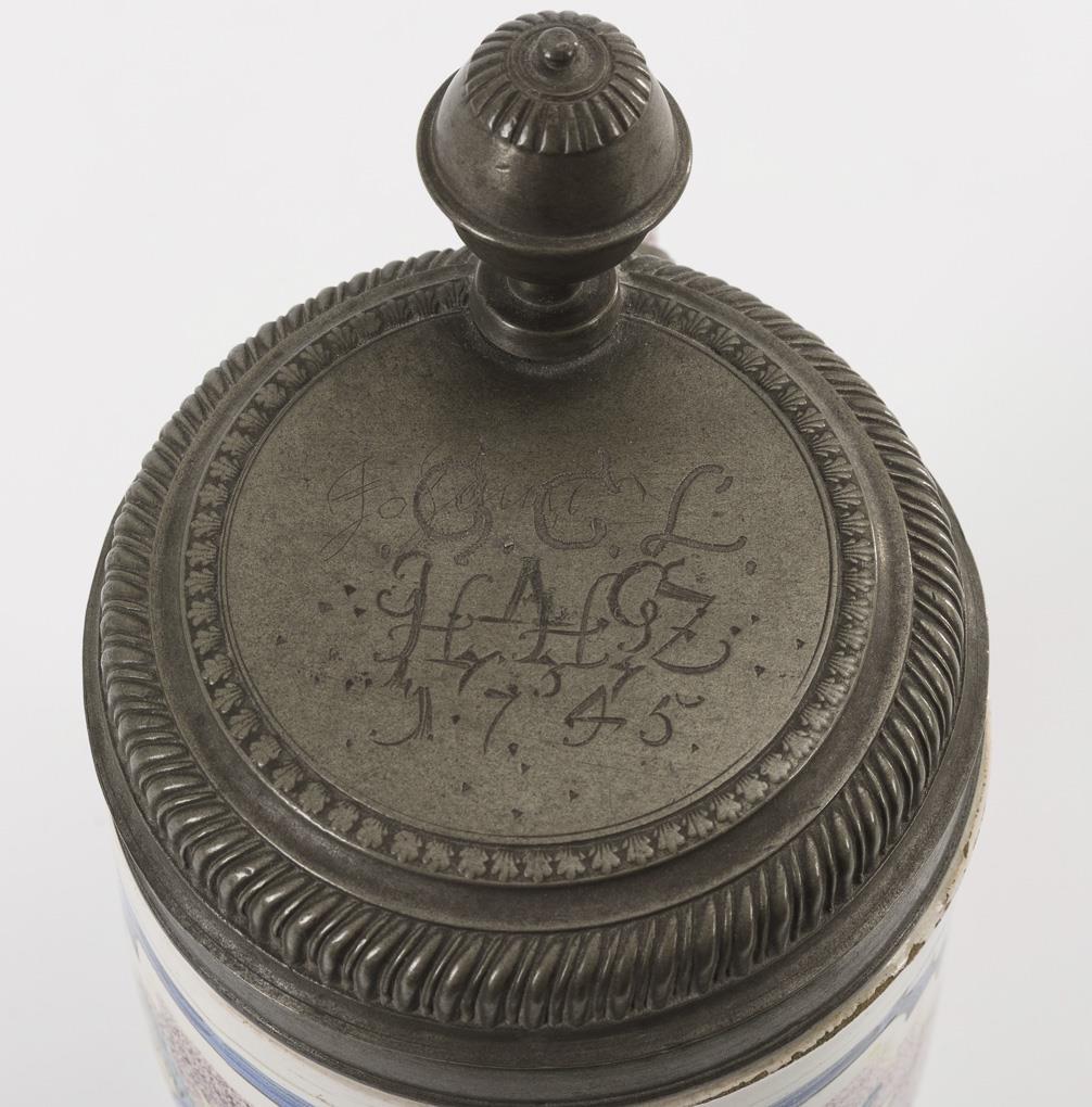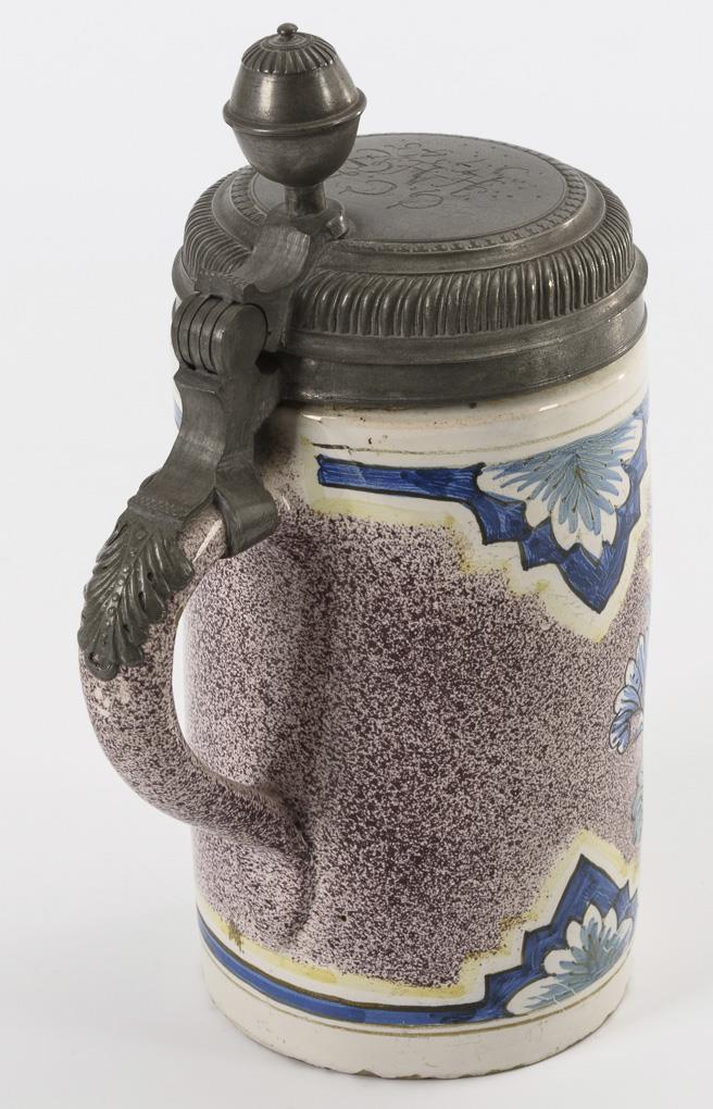 Cylindrical jug with manganese aspirated wall and ribbon handle. Baroque reserve on the front with floral decoration. Profiled pewter lid with ball pusher, engraved several times, dated "1745", hallmarked inside. Partial light glaze rubbing and bumping.