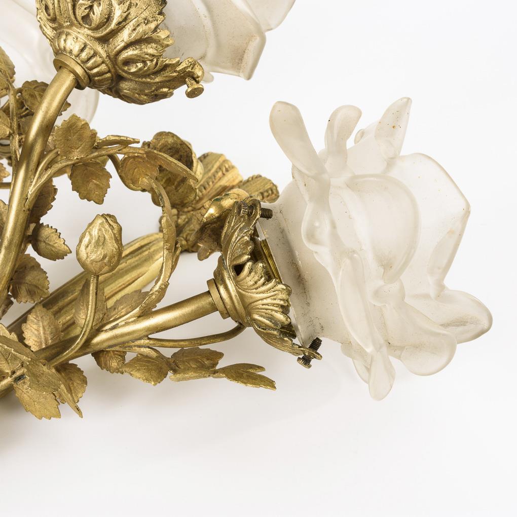 On ribbon-like wall mount with fluttering ribbons and tassels suspended rose branches with 3 flower-shaped glass shades. Minimal chips on the glass, 1 bronze leaf missing.
