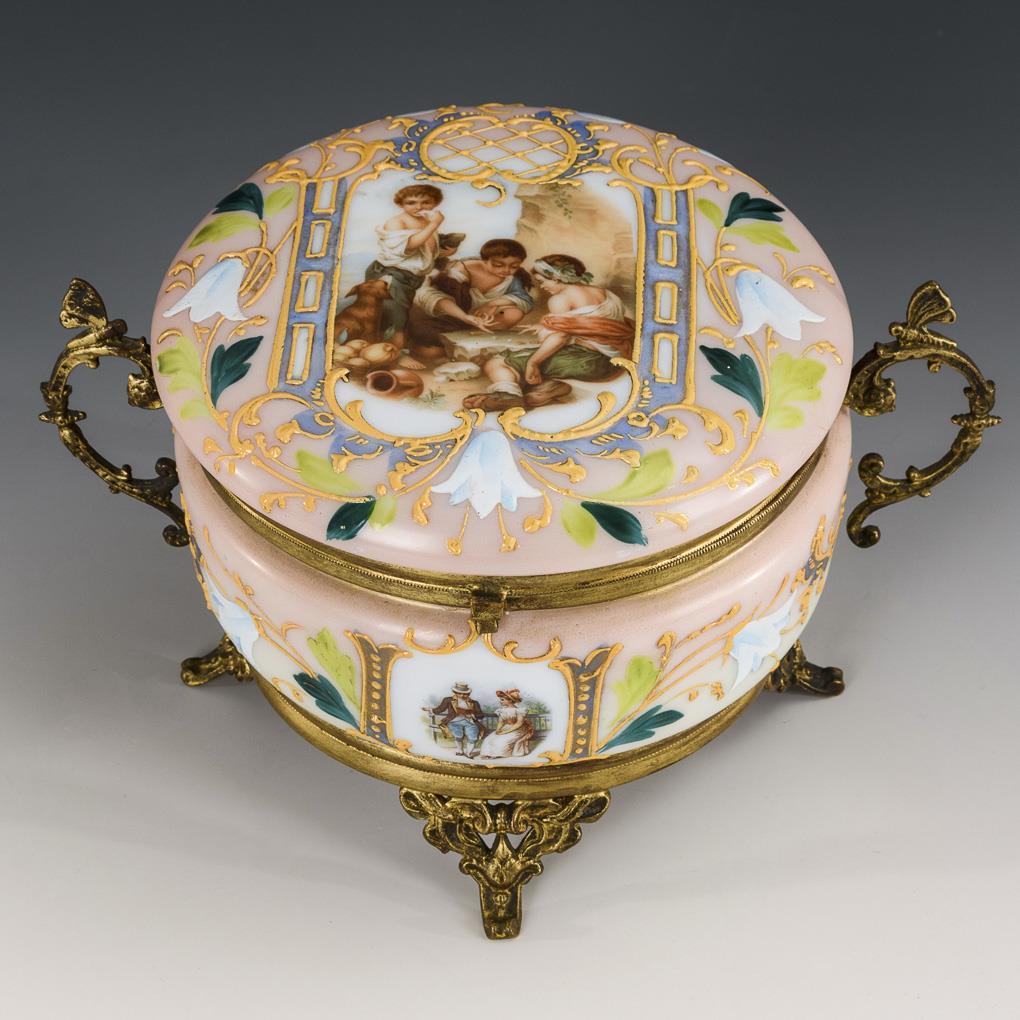 Cylindrical box with pink gradient background and bronze mounted stand, two handles and hinged lid. On the lid a decorative painting after Murillo with children playing dice, all sides floral and rocaille painting.