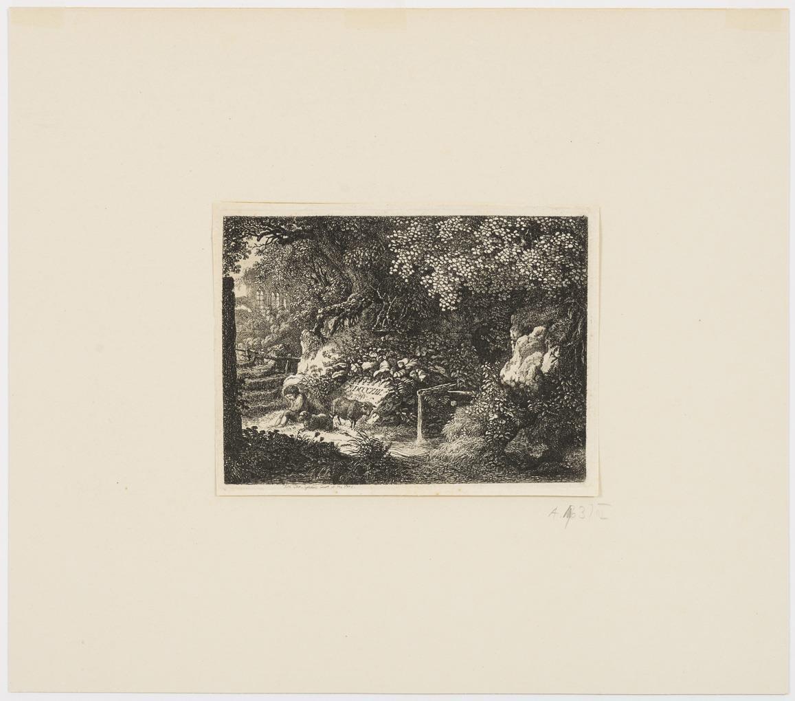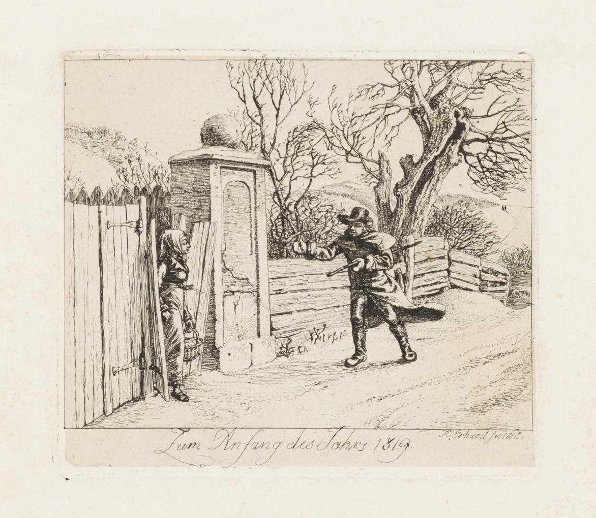 New Year's Ticket to the Beginning of the Year 1819: Winter Landscape, plate: 11.5 x 13 cm, sheet: 15 x 16 cm, in passepartout: 35 x 31 cm, etching on rolled China, some foxing | New Year's Ticket to the Beginning of the Year 1813: Boy with sheep in front of stone, sheet: 11 x 14 cm, in mount: 31 x 34 cm, etching on laid paper, watermark, sheet trimmed, minimal foxing.