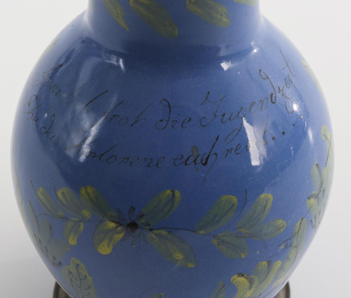 Pear jug with ribbon handle. Wall with branches and toast "Genießet froh die Jugendzeit, Ehe das Verlorene euch reut...". Pewter lid with shell pusher, pewter standring. handle and restored on wall.