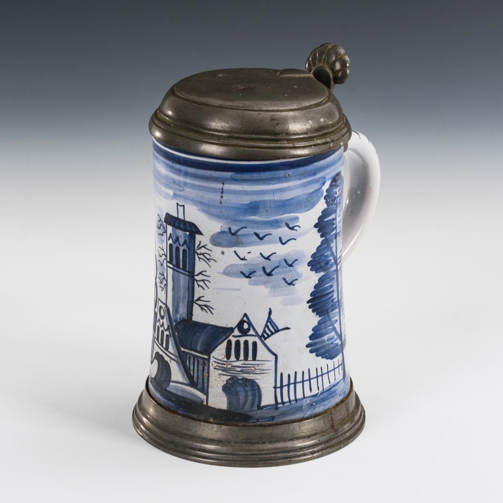 Walzenkrug mit Kirchenarchitektur zwischen hohen Bäumen, strichverzierter Bandhenkel, gepunzter Zinndeckel mit Muscheldrücker, Zinnstandring. Leichte Alters- und Gebrauchsspuren.