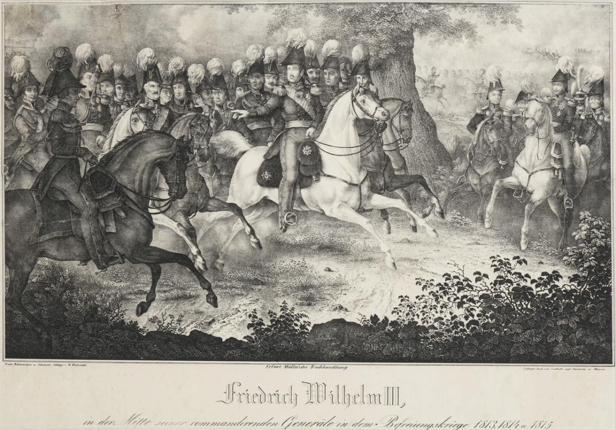 Military scene on the occasion of the wars of liberation from 1813 to 1815 to end the supremacy of France under Napoleon Bonaparte, inscribed "Frederick William III in the midst of his commanding generals in the war of liberation 1813, 1814 u. 1815".