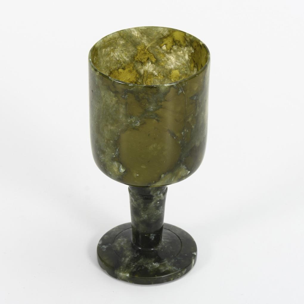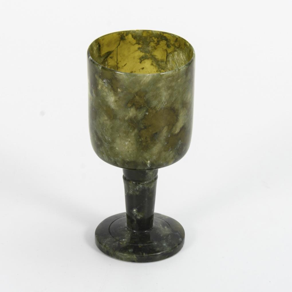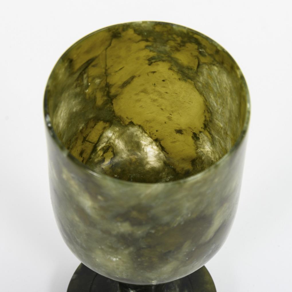 Dark green jade, slightly conical base with narrow fluting. Translucent dome with hairline crack.