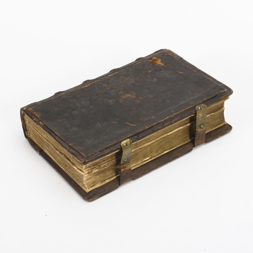 In two columns in black and red typography with gilt edges. 375, 96, 150, 101 pages, some with initials or in their places small pictorial illustrations, also pages with nones. Old, repaired leather binding with defective clasps. Probably not of the time. Good condition for the age.