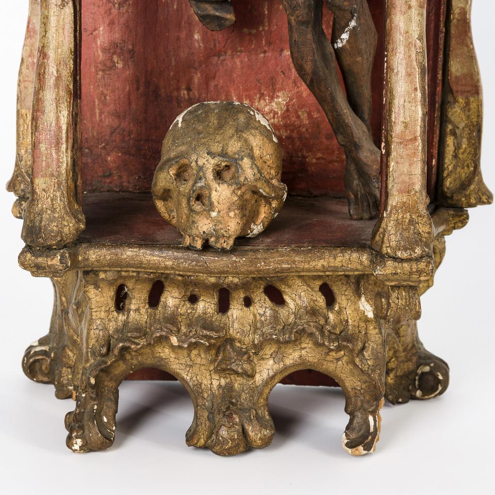Originally 3-sided glazed sham with rich Baroque decoration as well as applied skull. In the style of Gothic carved Corpus Christi. 1 arm of Jesus and thorns missing, thumb glued. A few missing parts on the shrine. Signs of age / use.