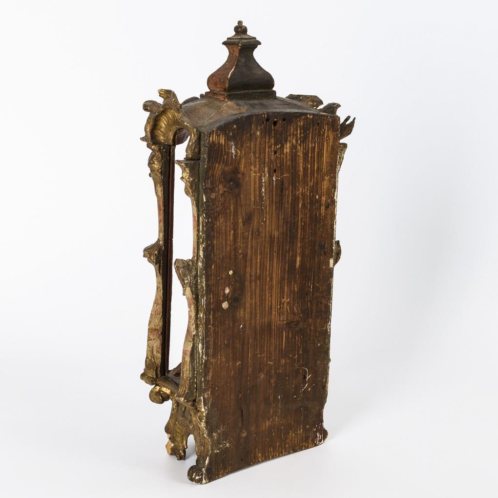 Shrine: Softwood red stained or gold bronzed. Christ: softwood dark stained. Shrine 18th c., Christ probably early 20th c. Shrine 48 x 24 x 13 cm, H Christ 28 cm (without arm).