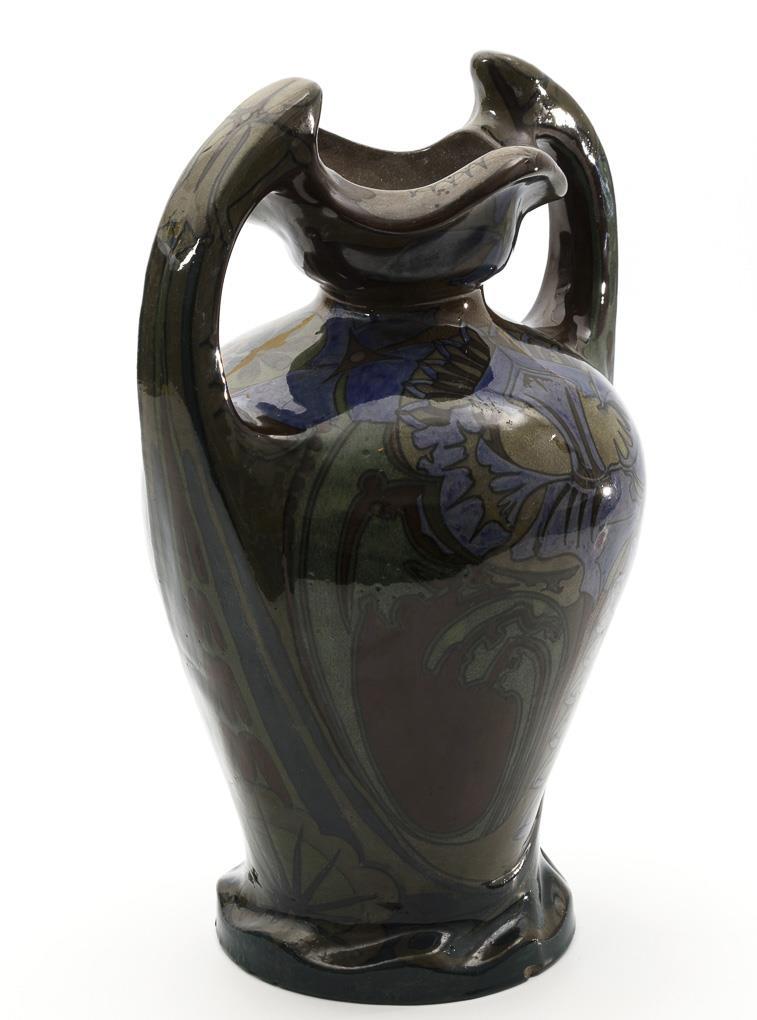 Large Art Nouveau handle vase with thistle decoration.