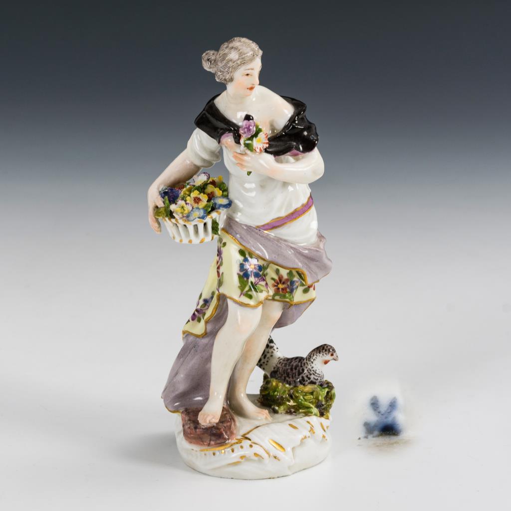 Auf einem Rocaillesockel mit Rebhuhnnest stehende Allegorie des Frühlings mit Blütenkorb. Rechte Hand restauriert, kleine Bestoßungen an den Blüten.