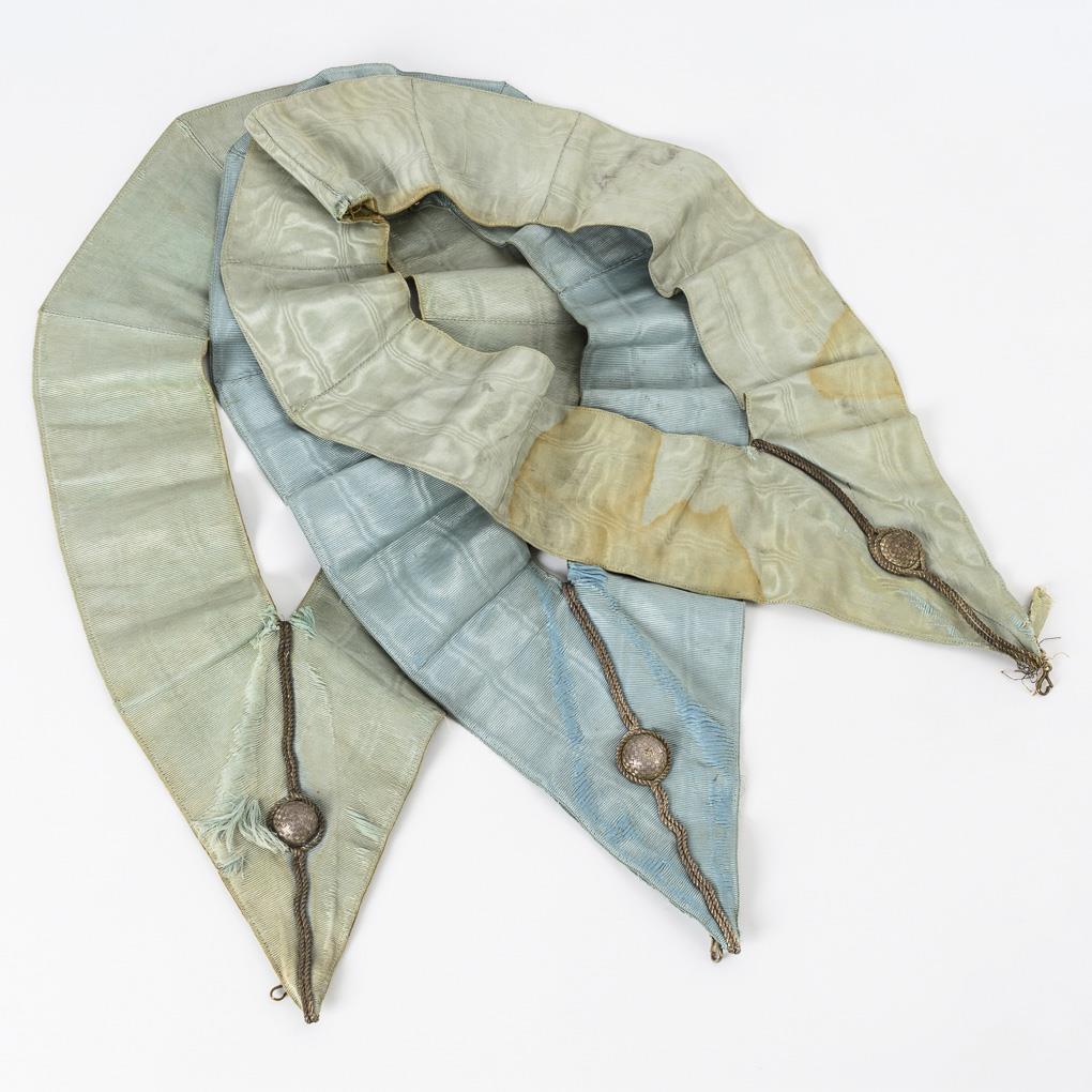 4 light blue gauntlets, 4 official ribbons in light blue with silver and dark blue with gold, 4 aprons partly with rosettes, tassels and Taus. 1 pair of white cloth gloves, 1 Beffchen, 2 light blue Bijou ribbons with snake hook, 1 snake hook, 1 Logenapplik without No., white ribbons. Traces of age / use.