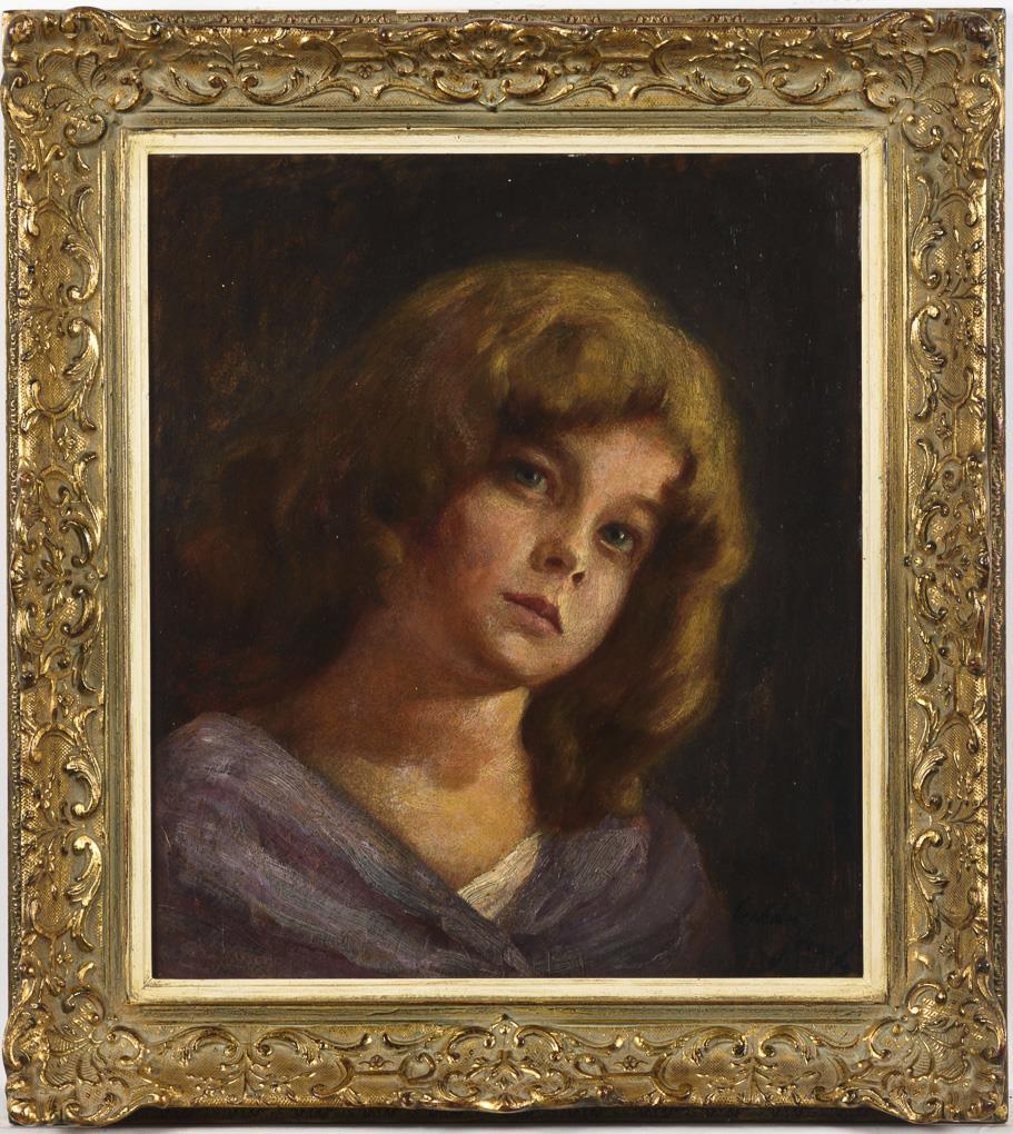 Portrait of a girl with blond hair and in purple clothes against a dark background. Minimal signs of age.