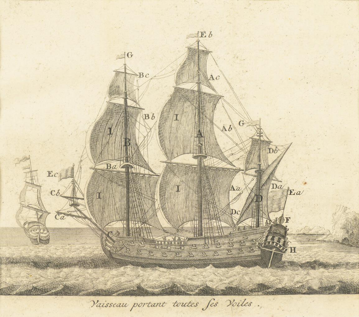 Multi-masted sailing ship with all its sails, inscribed "Vaisseau portant toutes ses voiles" and legend; from Abbot Noel-Antoine Pluche's (Abbé Pluche) encyclopedia "Le spectacle de la nature [...]", 1732 - 1743; frame with plaque "Georg Heinrich Wappäus 1830", founder of the shipping company in Hamburg. Sheet trimmed, folded several times.