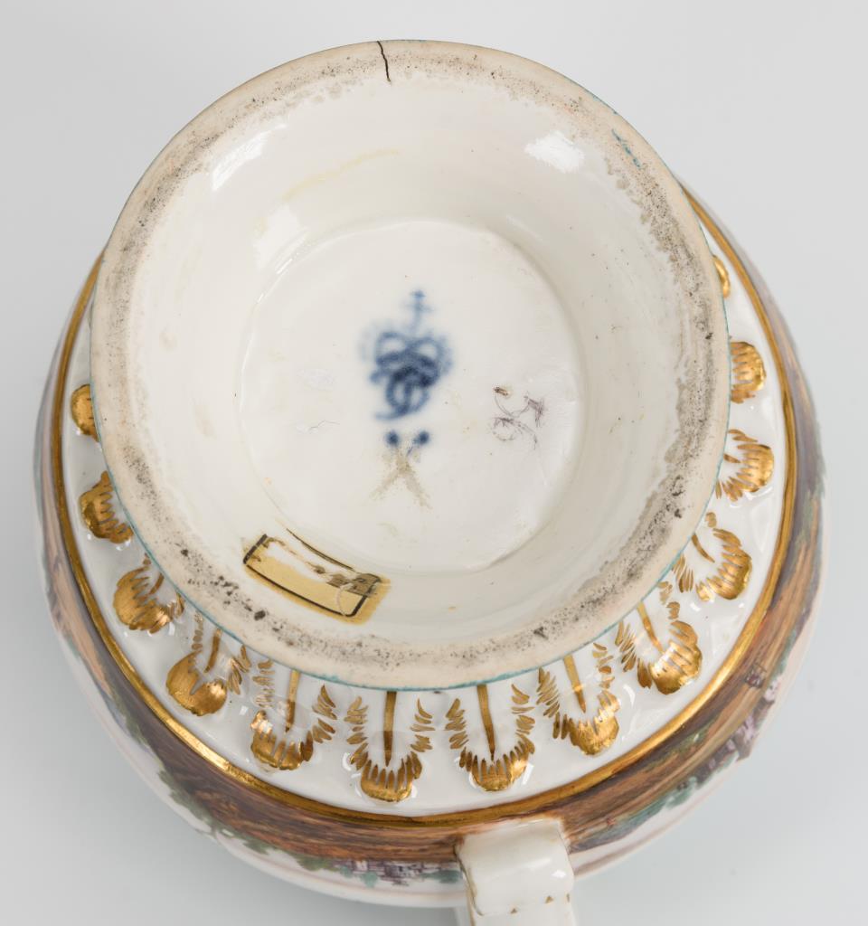 Bauchiges Kännchen mit blattreliefiertem Stand, Röhrenausguß und ergänzter Knaufdeckel. Türkisblauer Teilfond, umlaufend die Darstellung einer idealen Landschaft. Kleiner Brandriss am Stand, Deckelnasen fehlen.