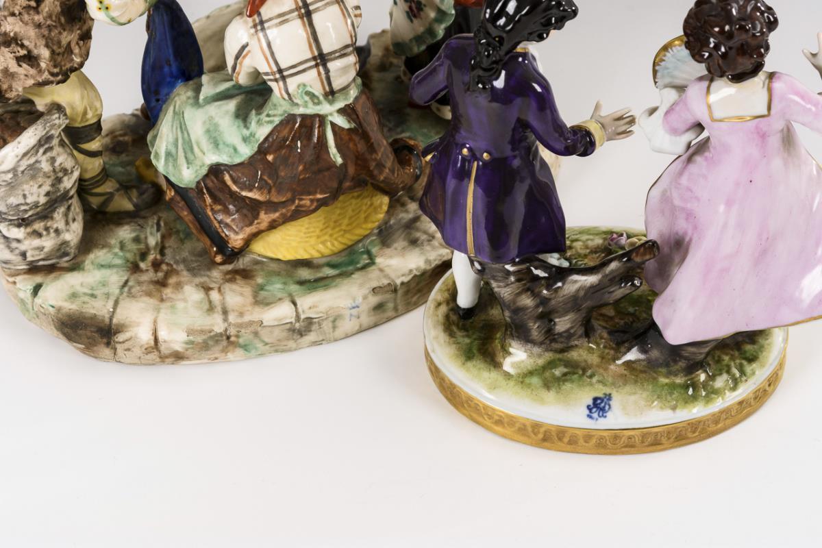 Polychrome painted, gold decorated. Gallant pair of children (h 14 cm). / Peasant group (h 17 cm).
