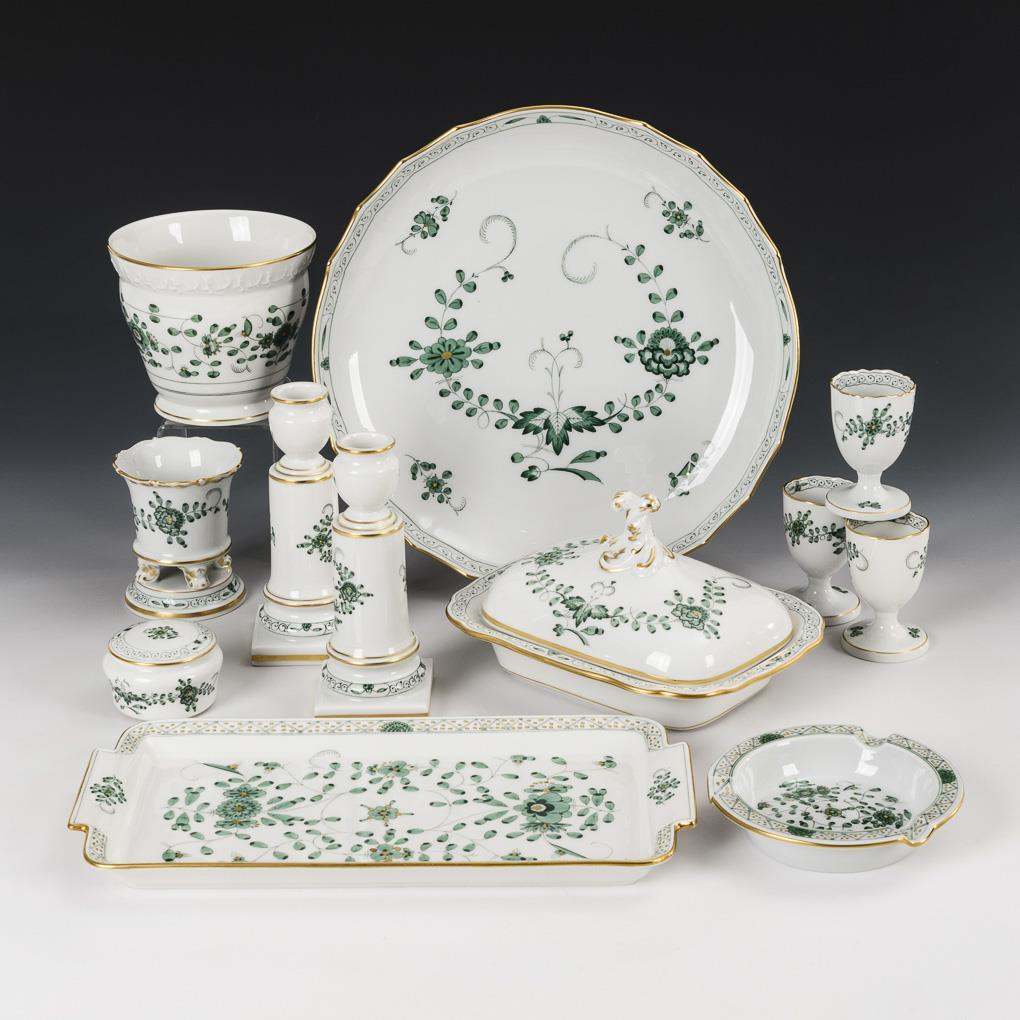 Bowl (Ø 28 cm), king cake plate (L 30 cm), butter dish (14 x 19 cm), cachepot (H 10,5 cm, Ø 12 cm), vase (H 9 cm), 2 candlesticks (H 16 cm), 3 egg cups (H 7,5 cm), 1 ashtray (Ø 12,5 cm) and 1 small box (Ø 6,5 cm).