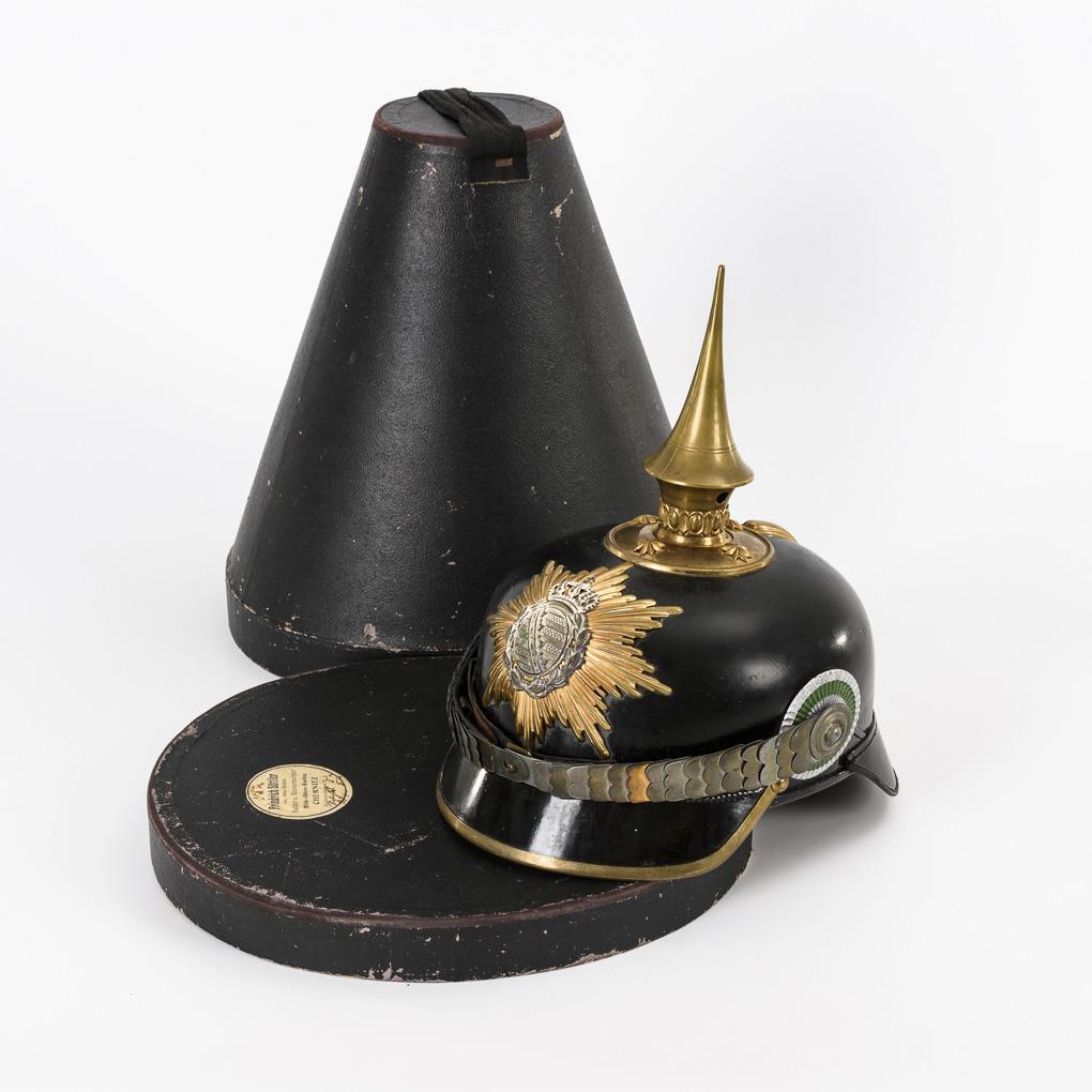 Pickelhaube with leather bell and brass scale chain. Silver Saxon coat of arms on star. High peak, disk of peak with star screw heads. Interior light silk rib, loose, leather sweatband torn out. Inner visors natural color. Both cockades present. Minor abrasion mark on side. In hat box. Good condition.