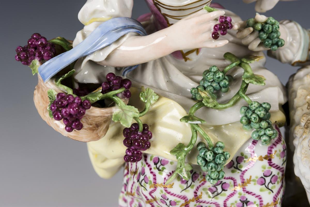On a stone base sitting young couple with grape basket and sheep. Hair crack in the base, partially leaves and hair bow of the man bumped.