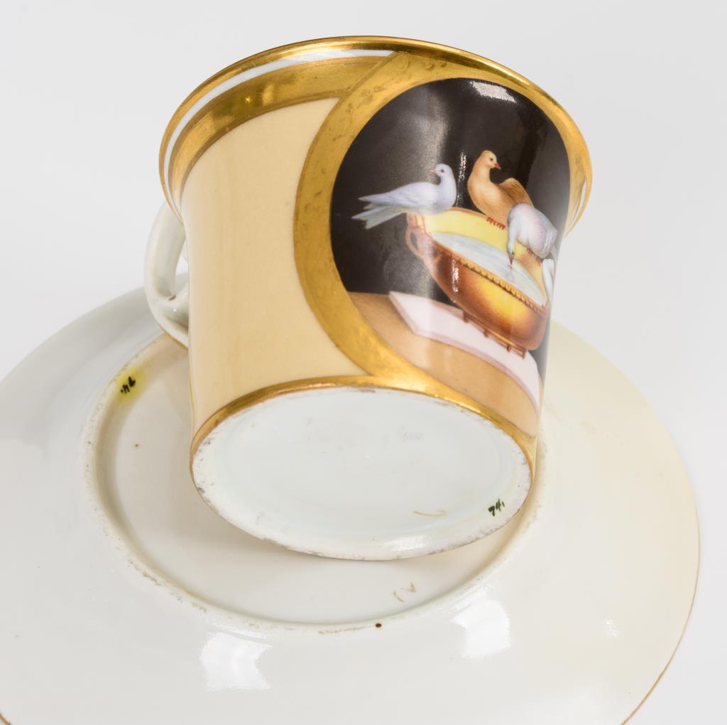 Kratertasse mit sandfarbenem Fond. Schauseitig auf der Tasse ein goldgerahmtes Medaillon mit der Darstellung des Motivs der "Trinkenden Tauben von Sosos" aus der römischen Villa Hadriana. Haarriss und Restaurierung am Untertassenrand.