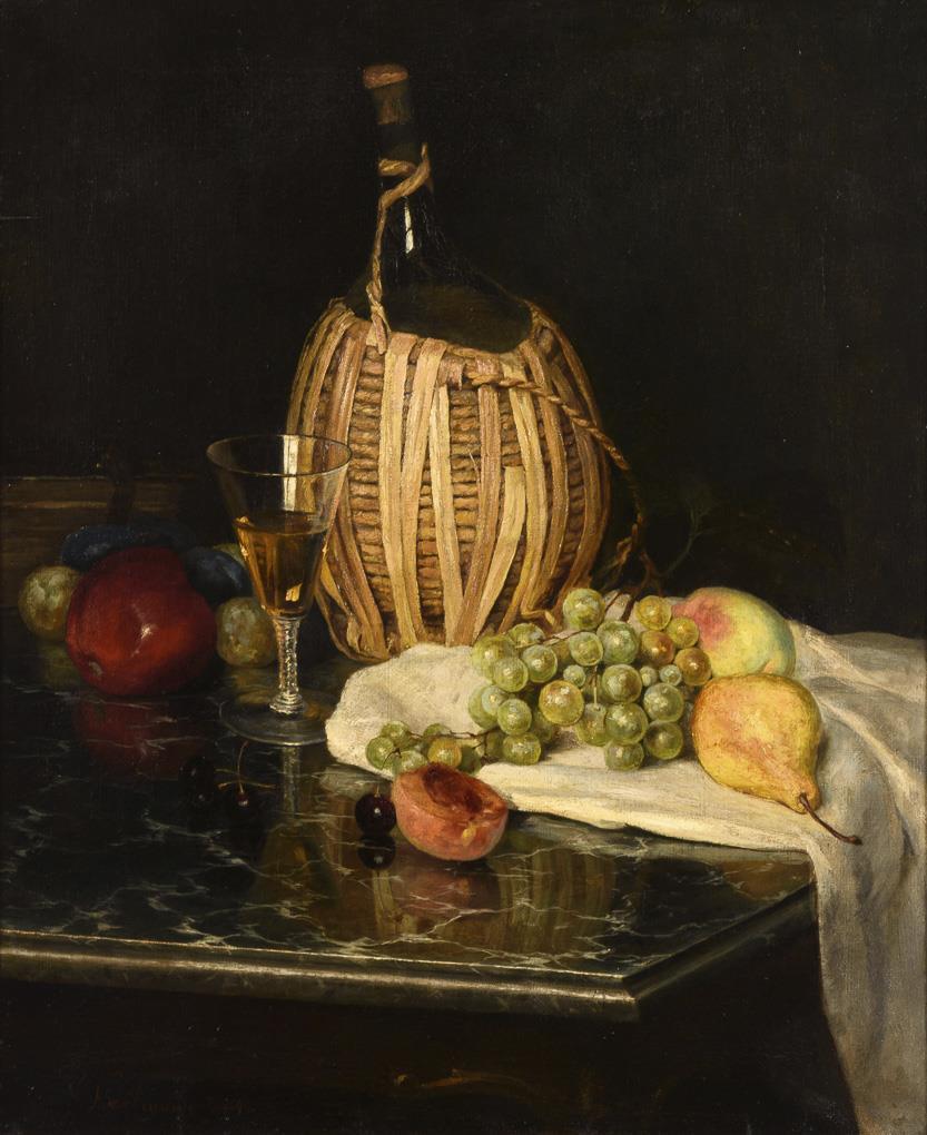 Wine bottle next to grapes, pears and apples and other fruits on a mirrored marble plate. Slight signs of age.
