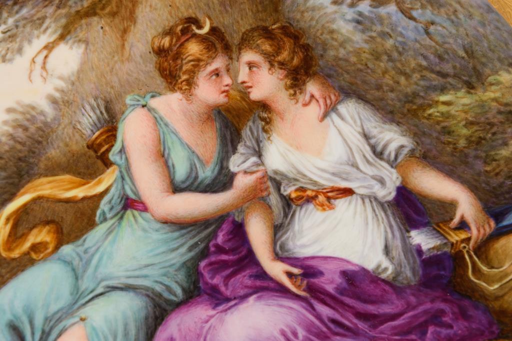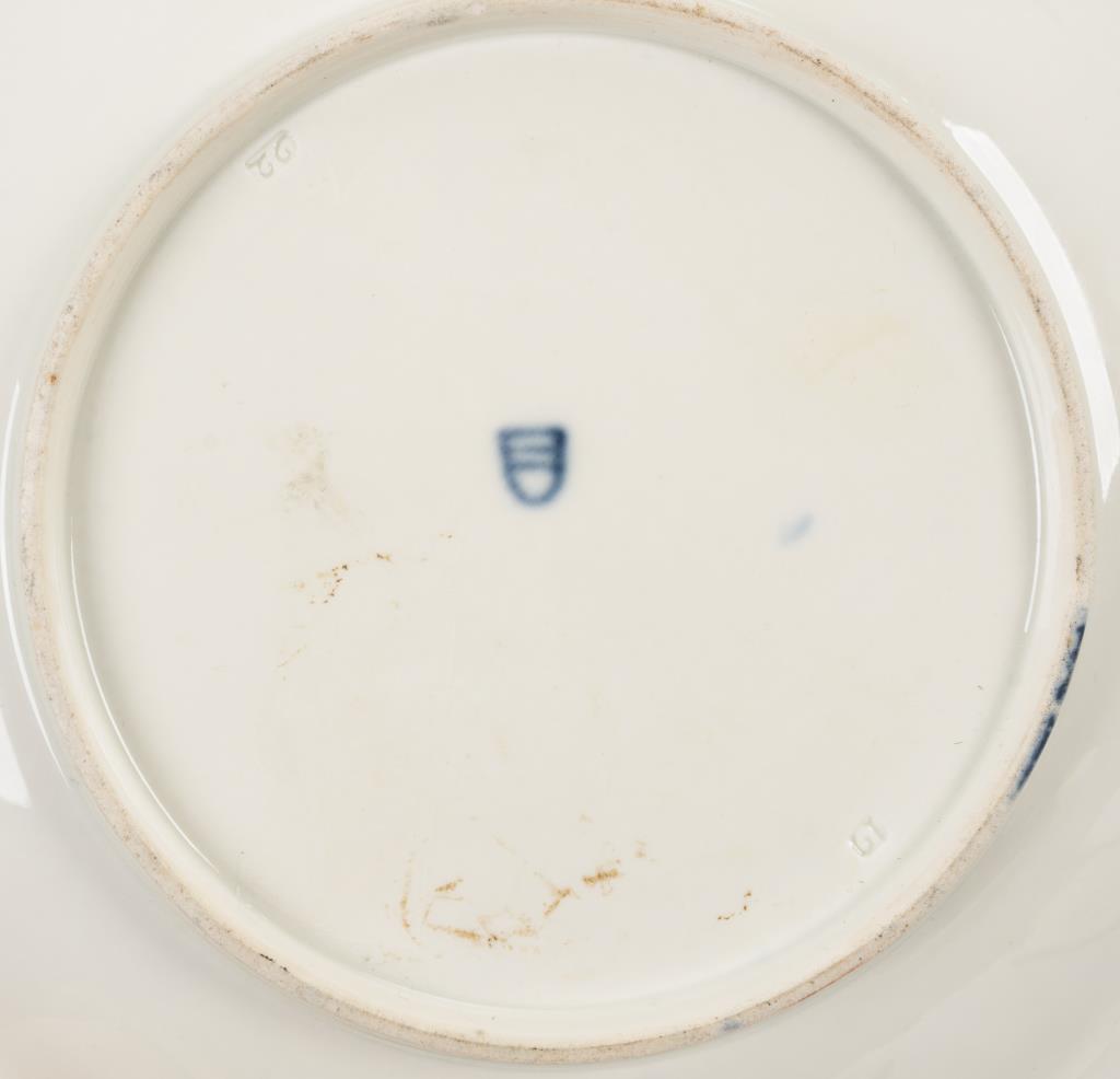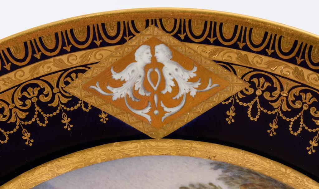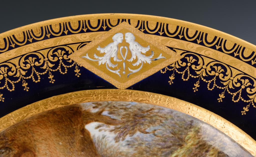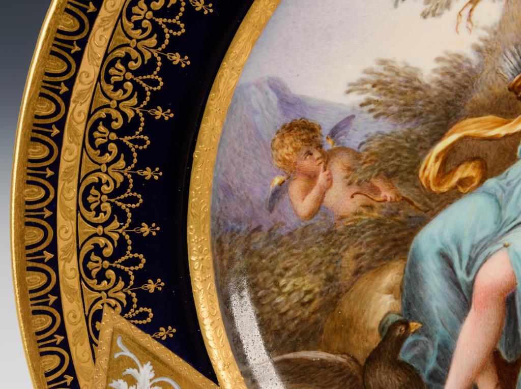 Teller mit kobaltblauer, reich ornamental reliefgoldbemalter Fahne, im Spiegel die Darstellung des in der Gestalt der Jagdgöttin Diana der Nymphe Callisto sich nähernden Jupiters, nach einem Gemälde von Angelika Kauffmann (1741-1807). Minimale Kratzspuren auf der Malerei.