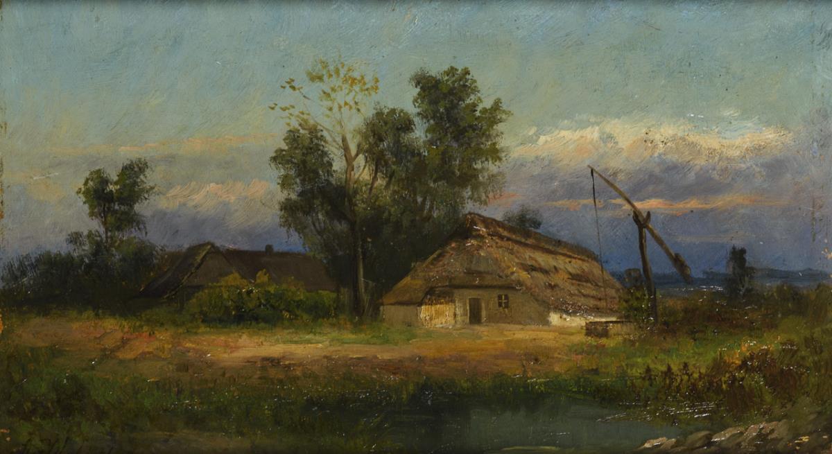 Thatched farmhouse with well in wide, flat landscape. Minimal signs of age.